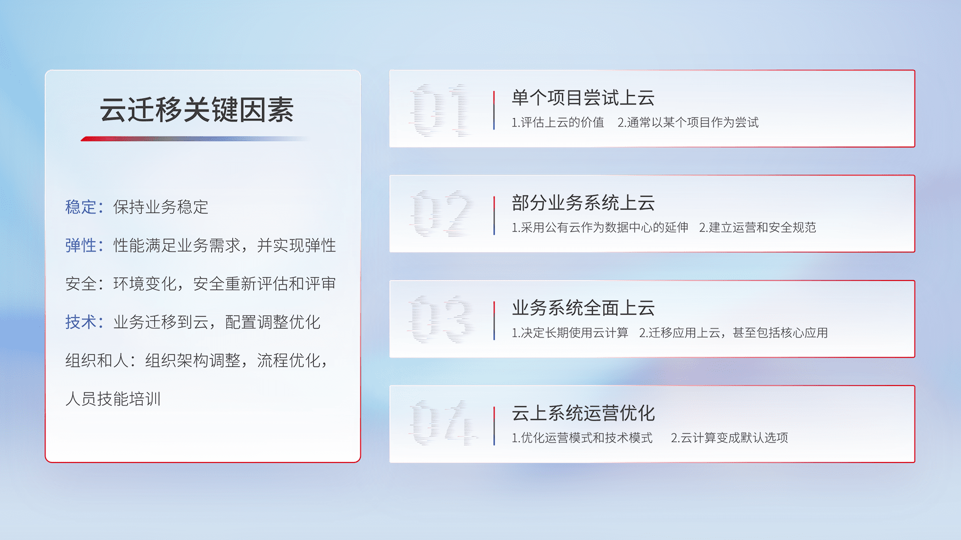 结合实际业务,,,,从规划设计、、、云平台选型、、、云原生改造、、、数据迁移、、、集成交付,,,,迁移全过程为客户识别最佳上云路径,,做好风险识别管理,,,,设计网络架构、、、身份权限、、、安全审计合规、、、、操作审计、、、、日志审计、、、监控告警策略、、多站点容灾设计等,,对云上基础设施进行整体规划,,,提升IT治理水平,,以满足弹性、、、高可用、、高性能的需求。。。