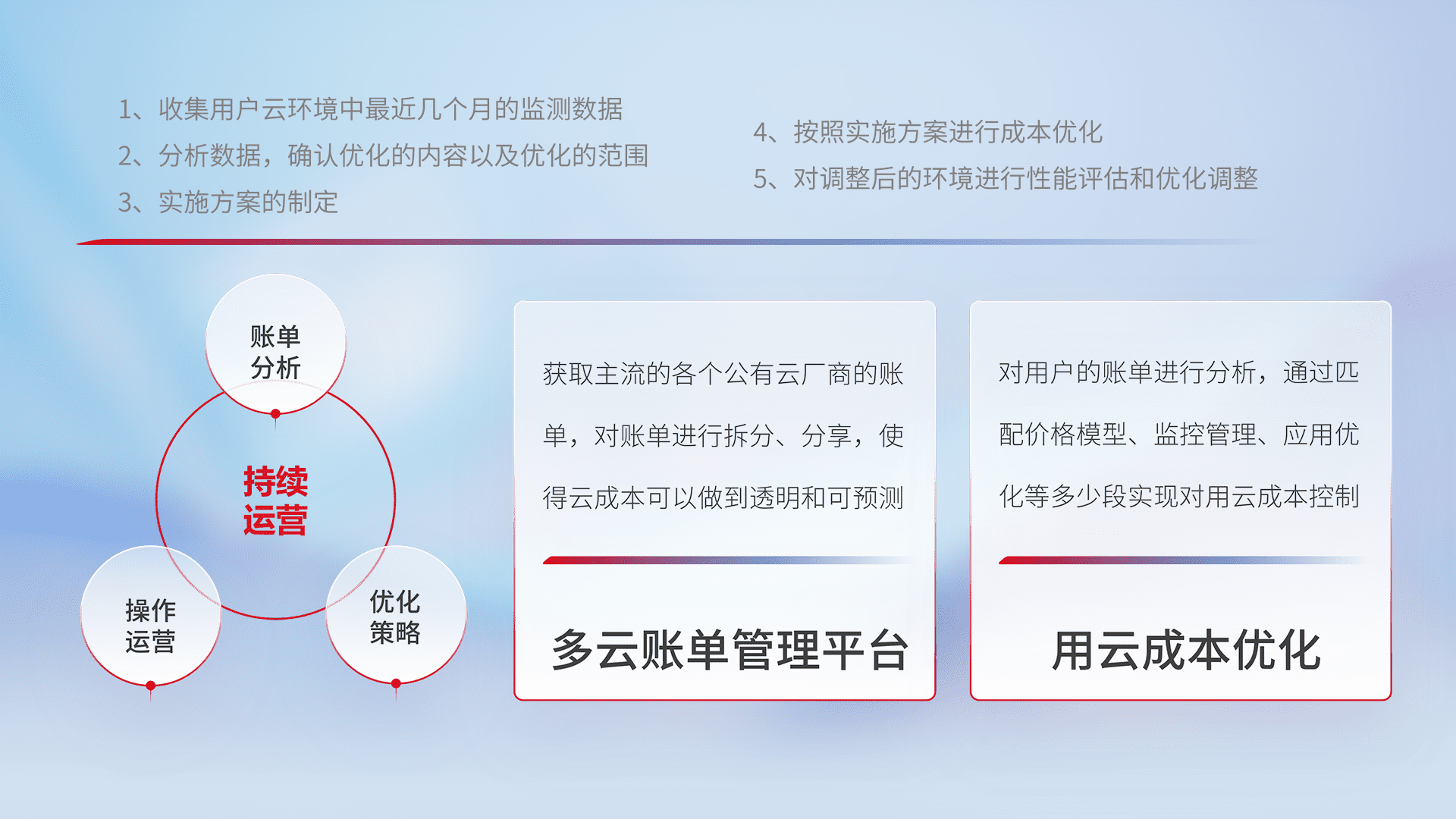 通过多云纳管,,,,以统一的资源数据模型把客户的云资源进行抽象和封装,,,,进而实现对多云资源的统一操作,,,,保障云资源管理的可靠性、、、、稳定性与可用性。。。量身定制化运维内容,,配置、、开发运维、、、、补丁管理、、备份、、监控、、、、认证和访问管理、、审计和日常巡检等,,,,保障在用云过程中的可靠度,,,稳定度以及高可用率。。